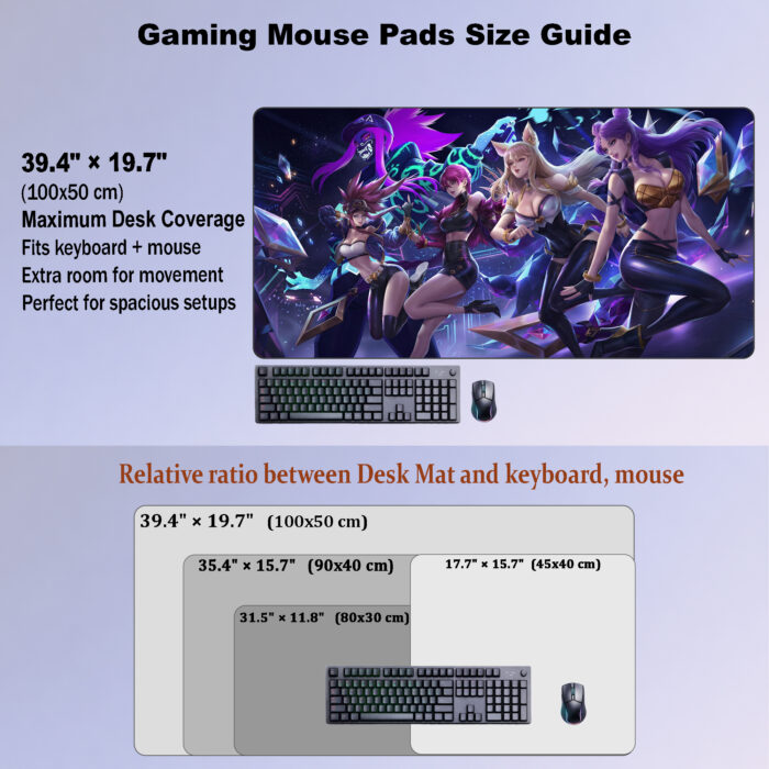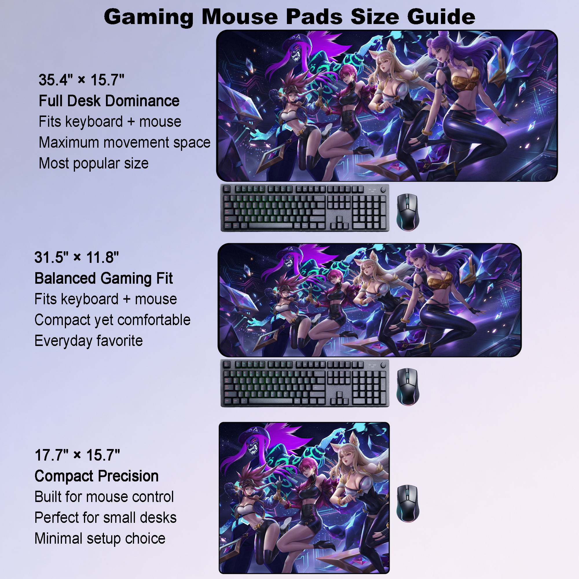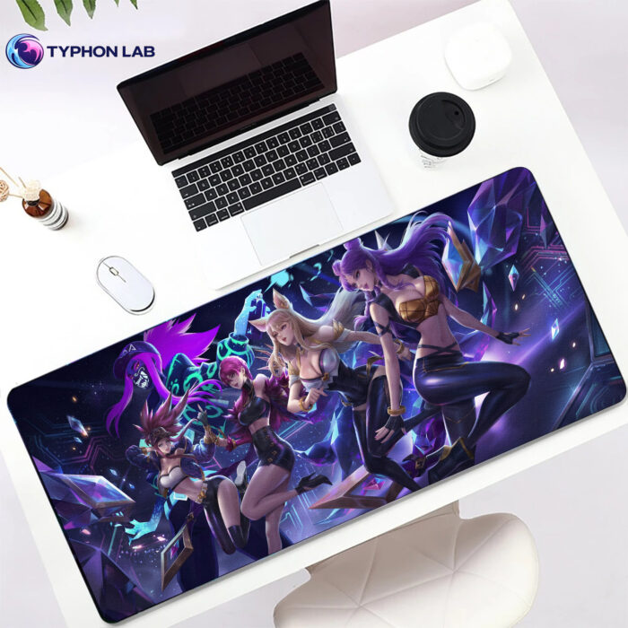 A striking K/DA desk mat featuring the group in a crystal-lit neon scene with rich violet tones and high-fashion energy. Bold, polished, and full of movement, this artwork brings a sleek performance aesthetic to any setup.