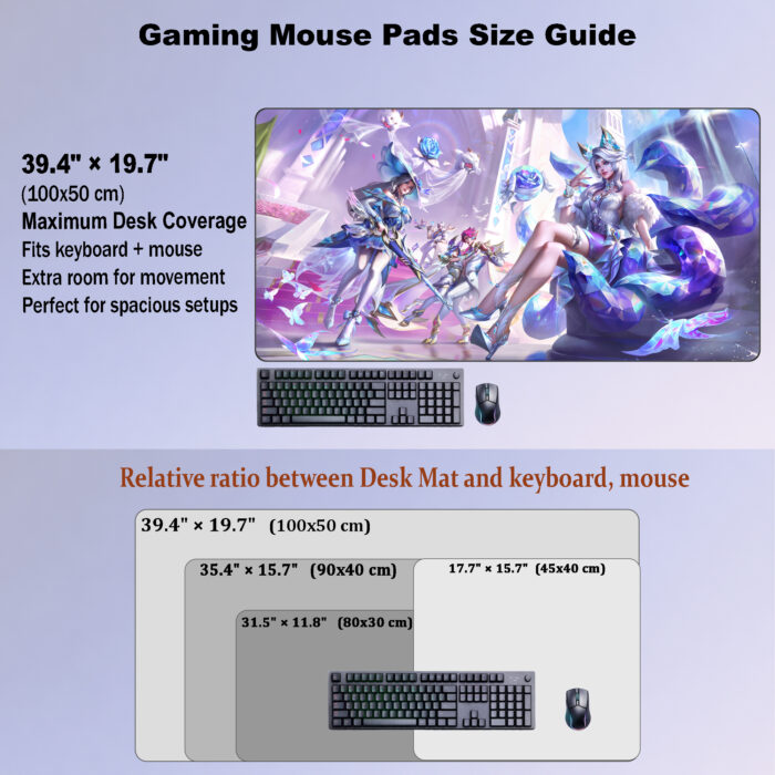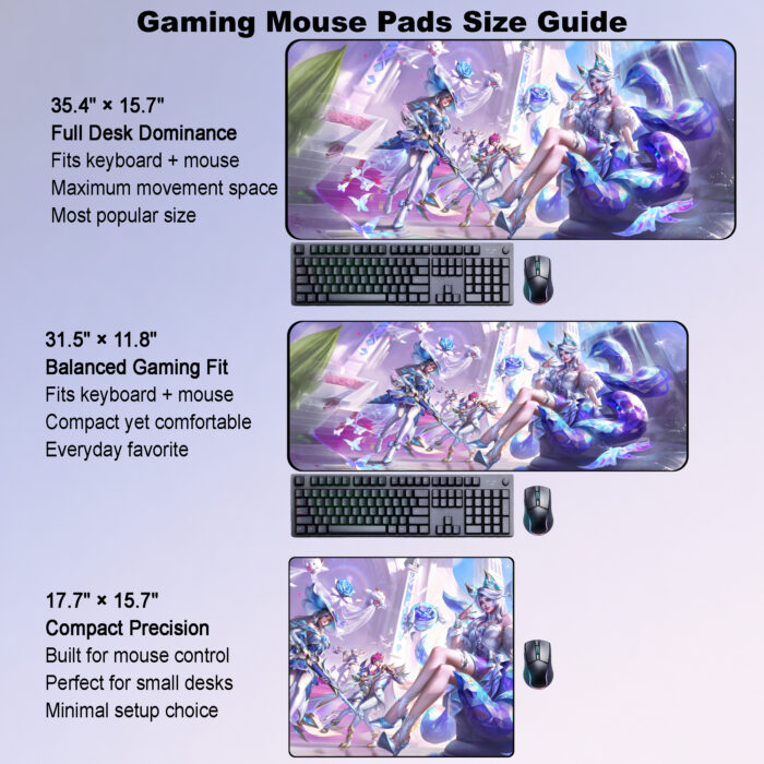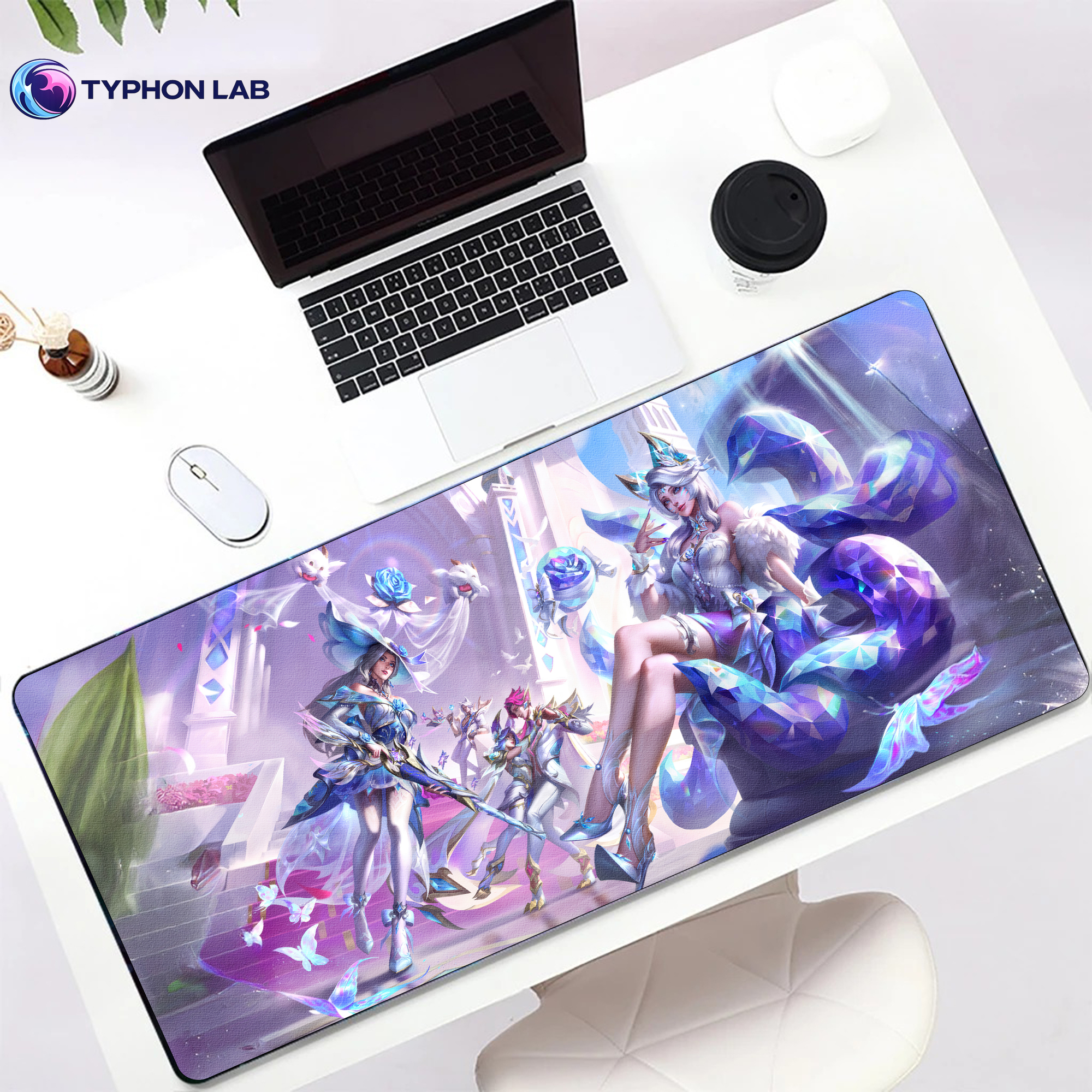 Add a dreamy fantasy touch to your setup with this Ahri, Caitlyn, Xayah, Rakan, Sett & Yuumi gaming mouse pad desk mat. Featuring elegant character artwork, a smooth surface, and 4mm thickness for added comfort, it is perfect for gaming, work, or streaming. Designed to give your keyboard and mouse a clean, spacious surface while upgrading the look of any desk setup.