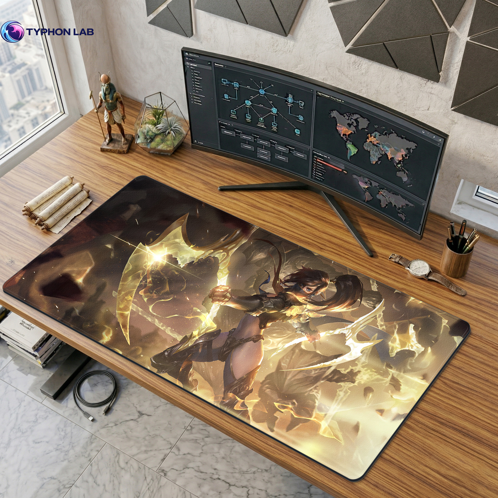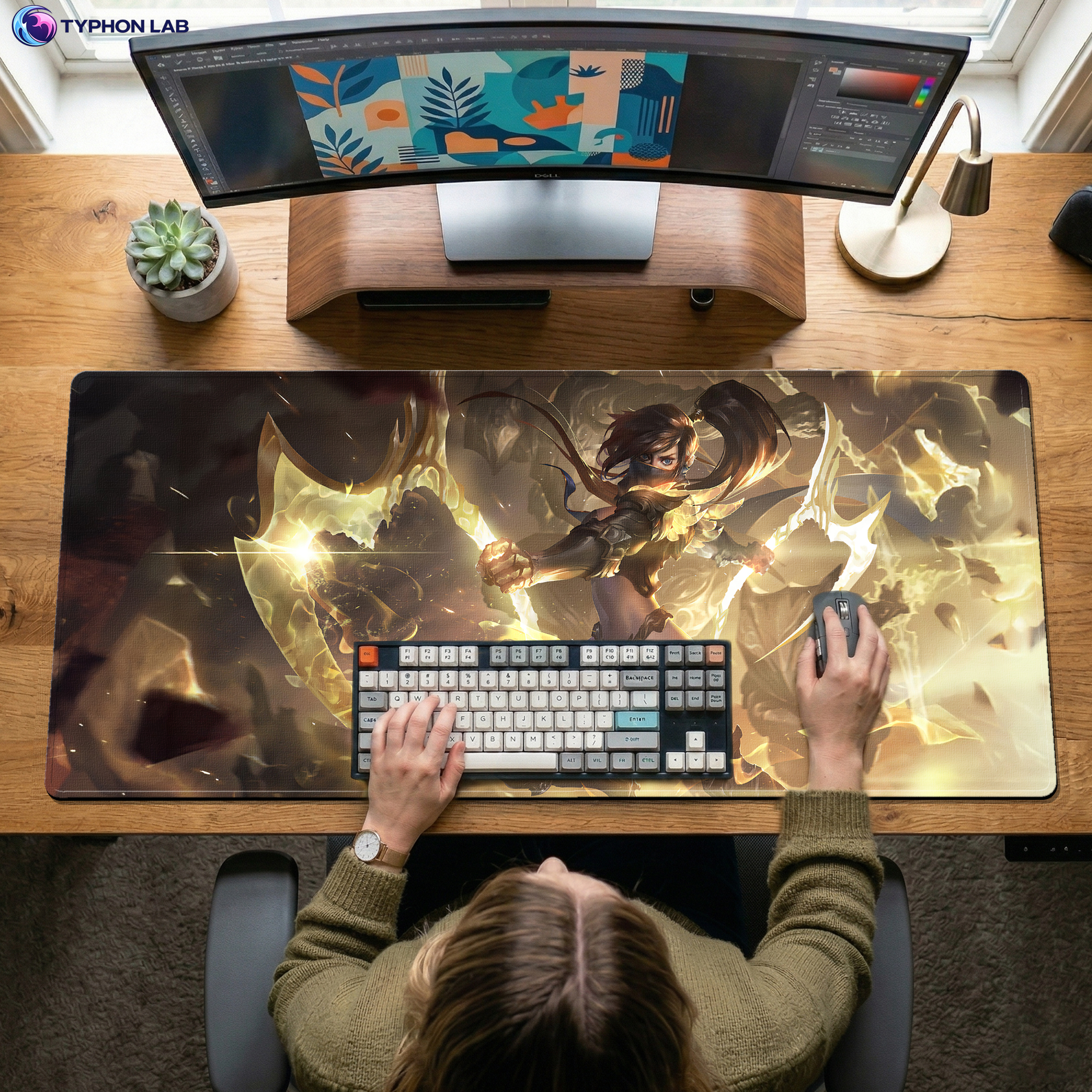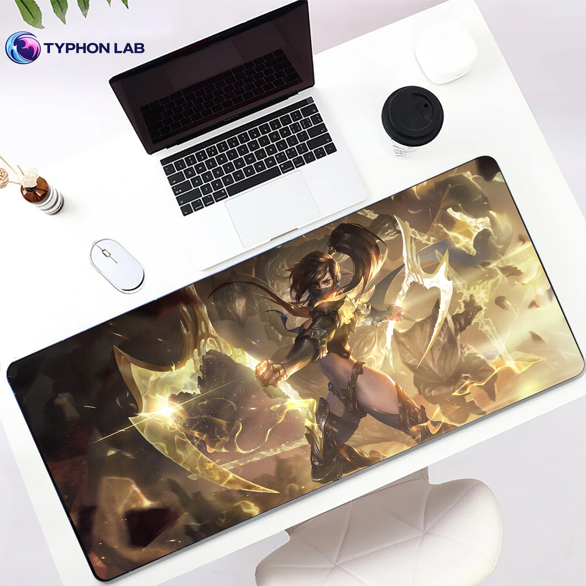 Bring fierce energy to your setup with this Akali-inspired gaming mouse pad. Featuring bold golden effects, dynamic fantasy artwork, and a battle-ready composition, this desk mat adds a powerful League-themed look to any desk.