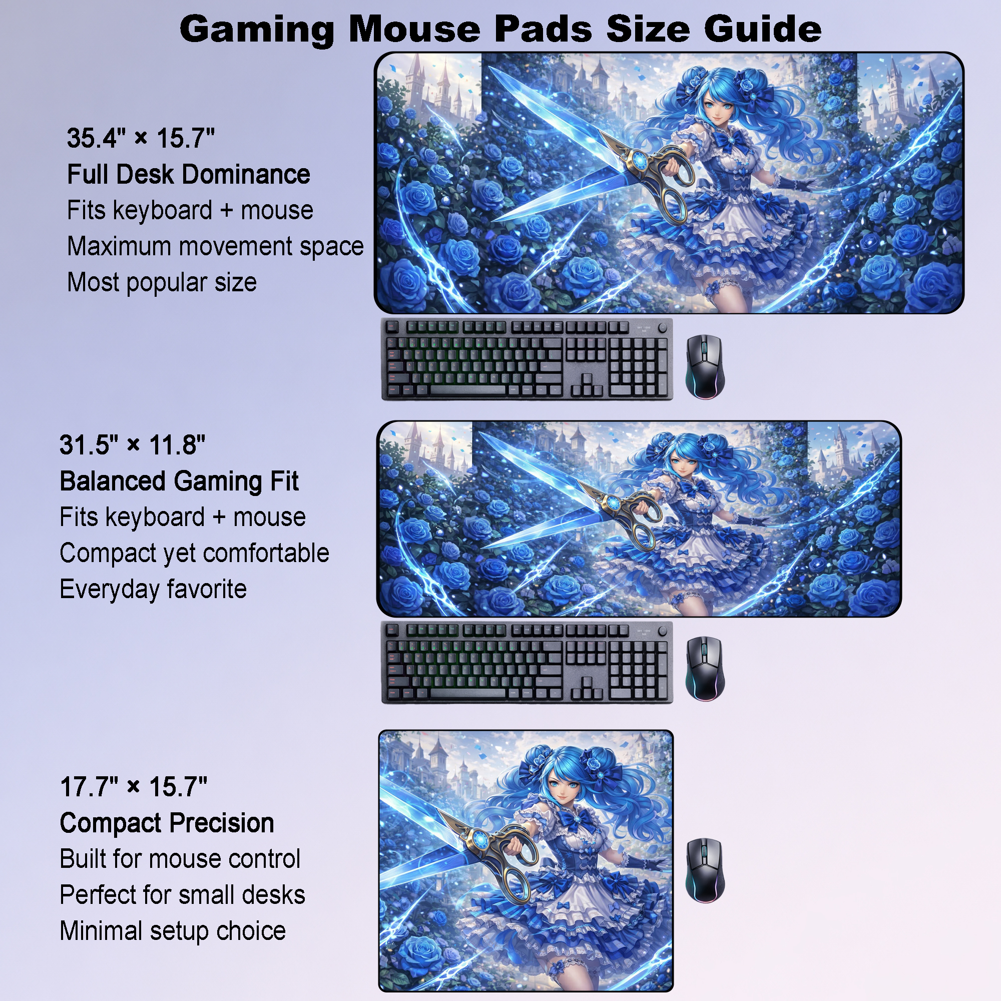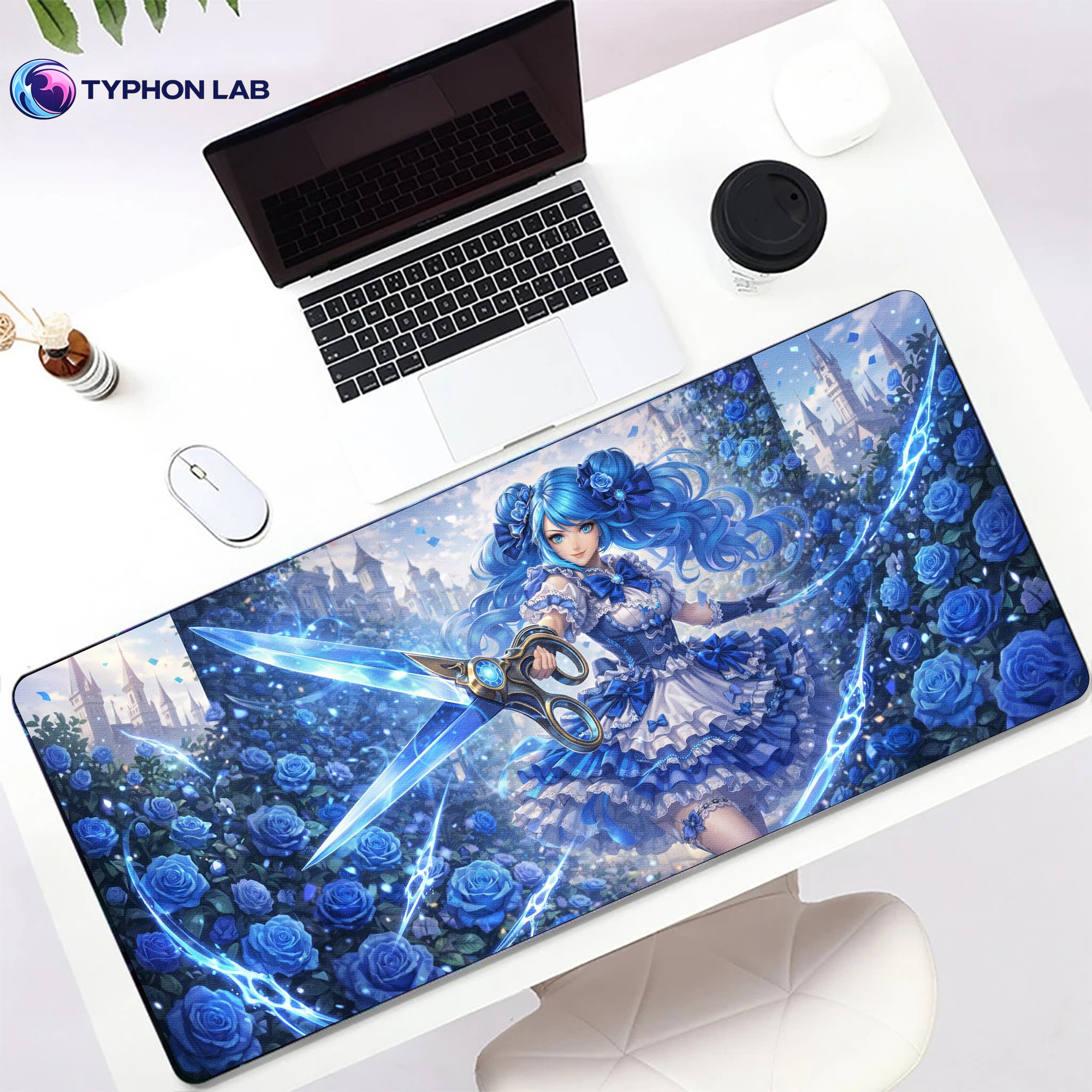 Soft, elegant, and sharp, this Gwen-inspired design features the Hallowed Seamstress surrounded by glowing blue roses, flowing ribbons, and her iconic oversized scissors. With its dreamy fantasy atmosphere and vivid blue tones, this mouse pad brings both beauty and precision to your desk setup.