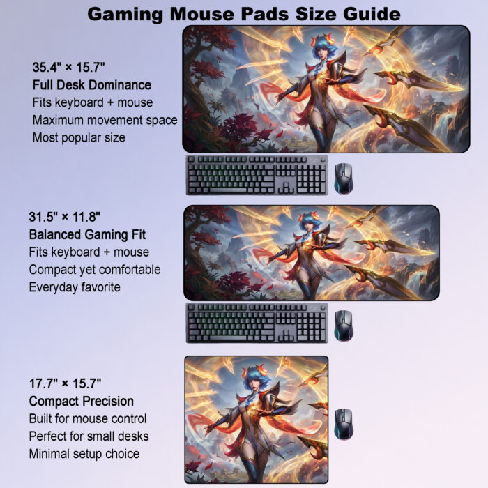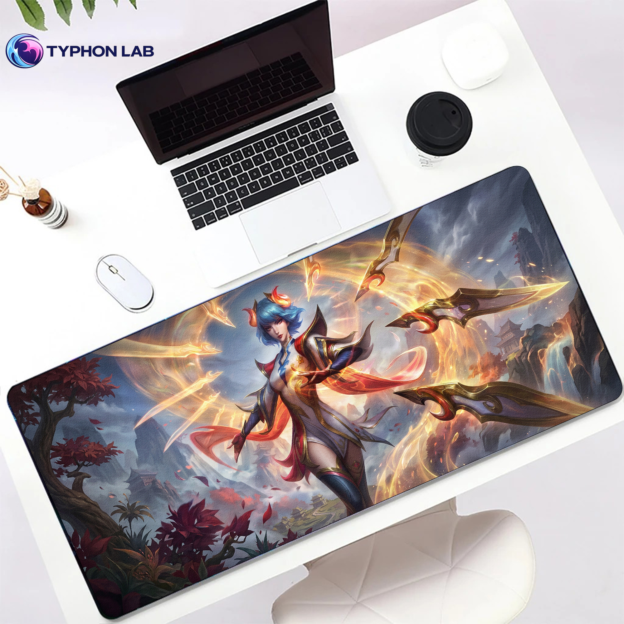 A radiant Irelia desk mat featuring her iconic floating blades, warm golden light, and a dramatic Ionian-inspired landscape. Elegant, sharp, and full of motion, this artwork brings a refined fantasy look to any setup.