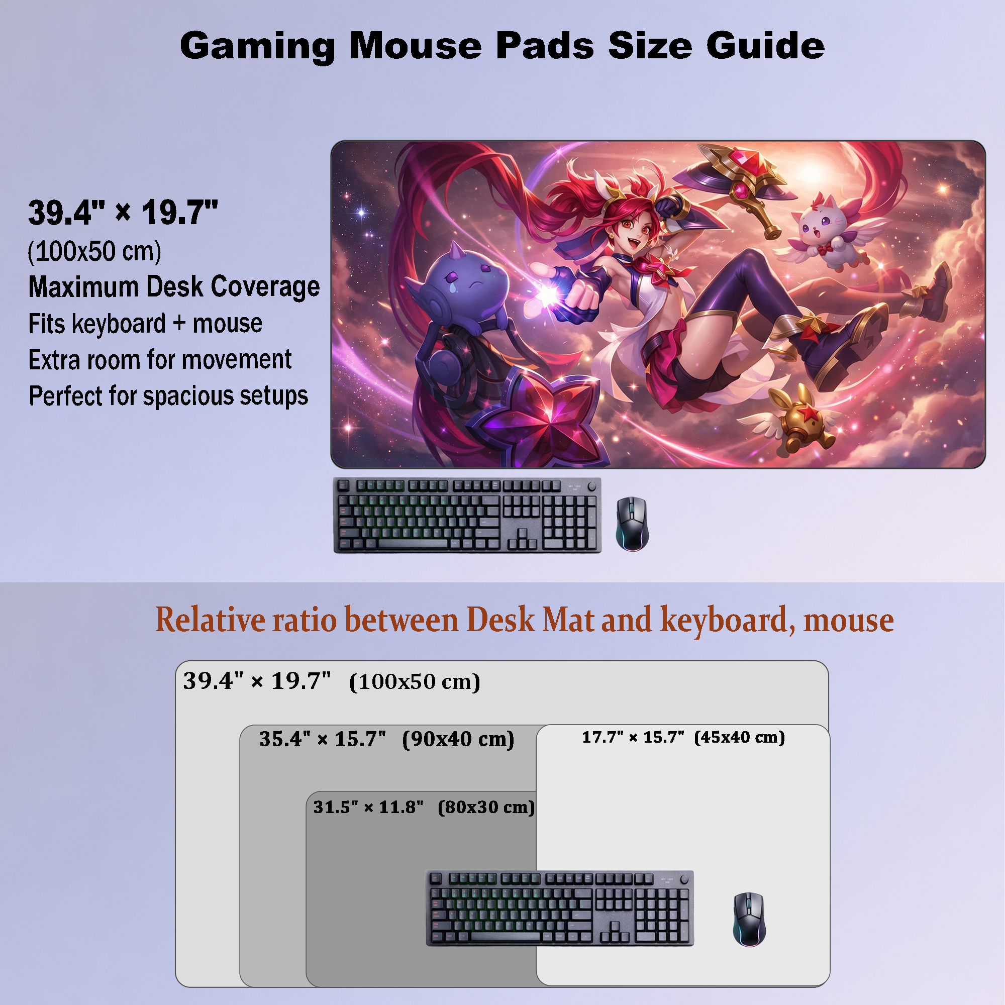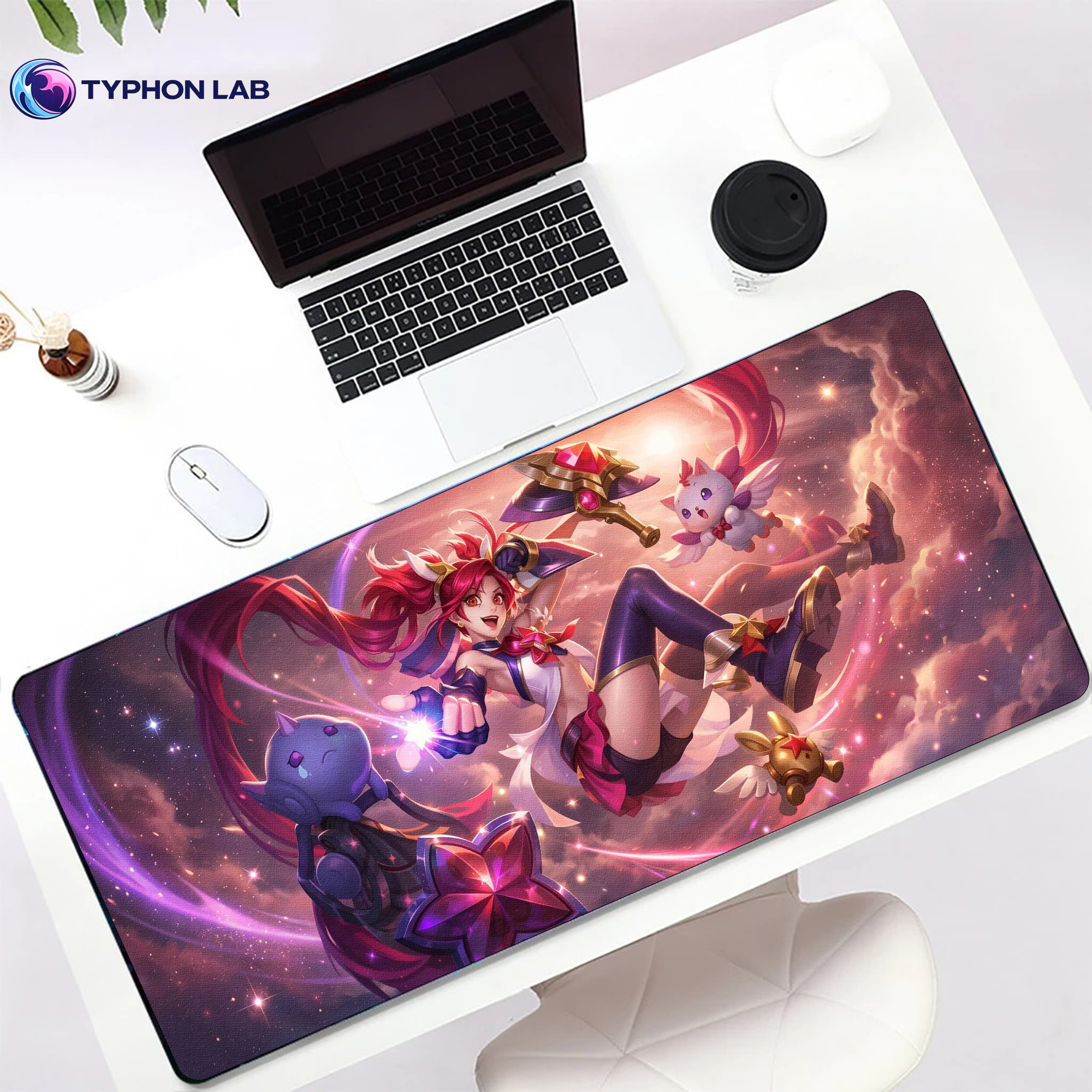 A playful Jinx desk mat set in a glowing cosmic sky, filled with sparkling light, floating companions, and vivid pink-violet color. Bright, energetic, and full of personality, this artwork brings a lighter and more whimsical side of Jinx to the desk.