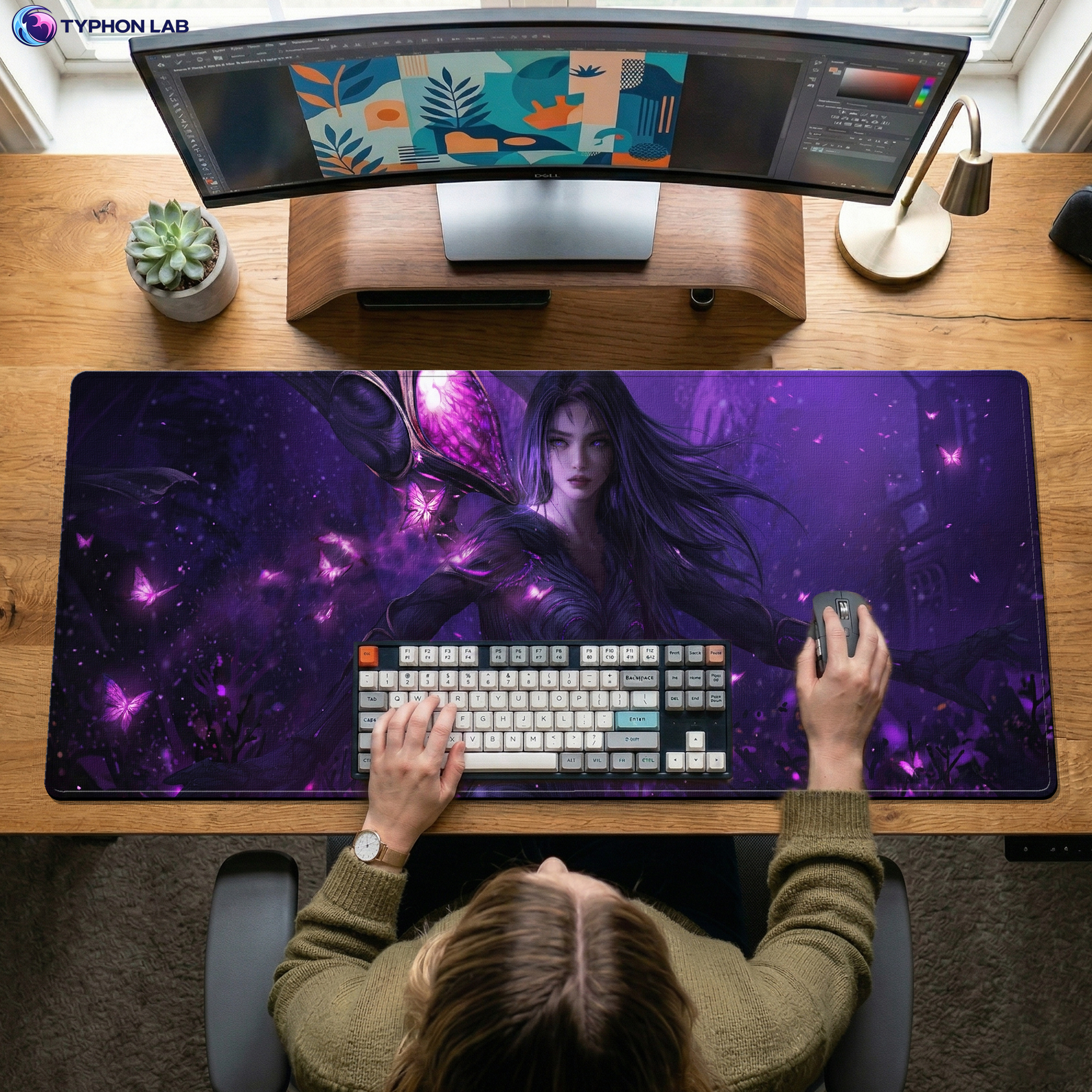 Featuring Kai’Sa in a dark purple fantasy scene, this desk mat brings bold champion-focused style and mysterious void energy to any setup.