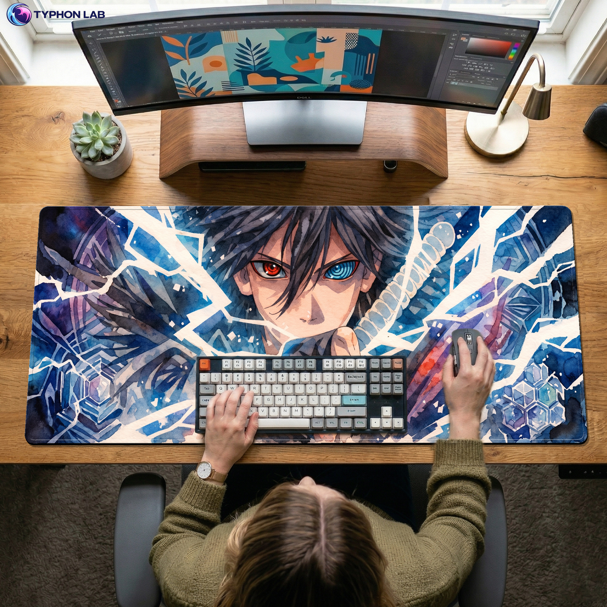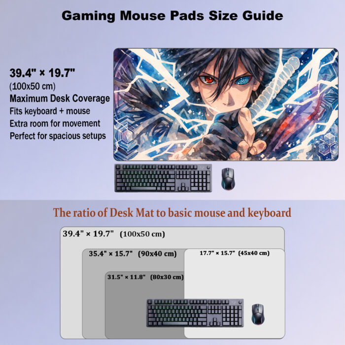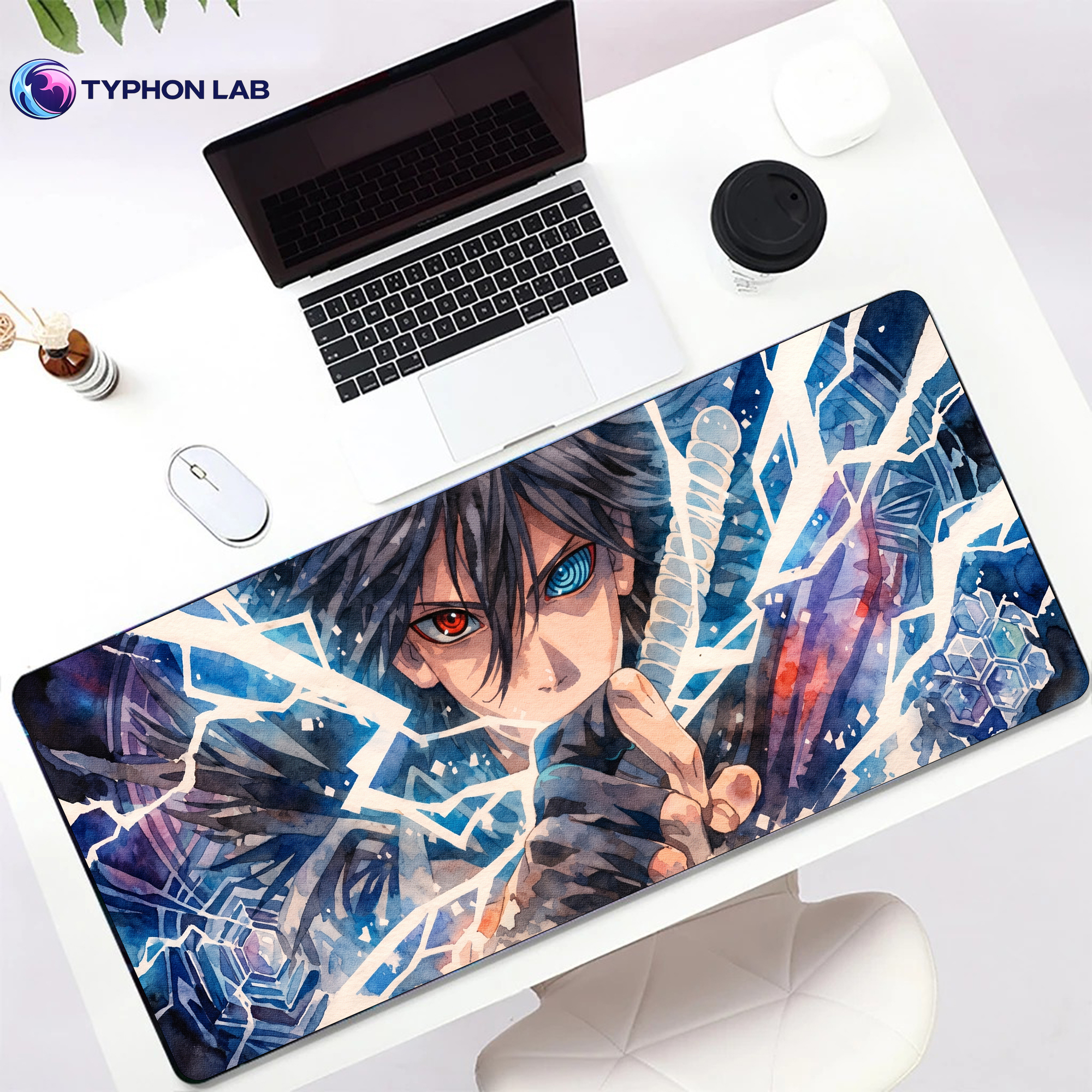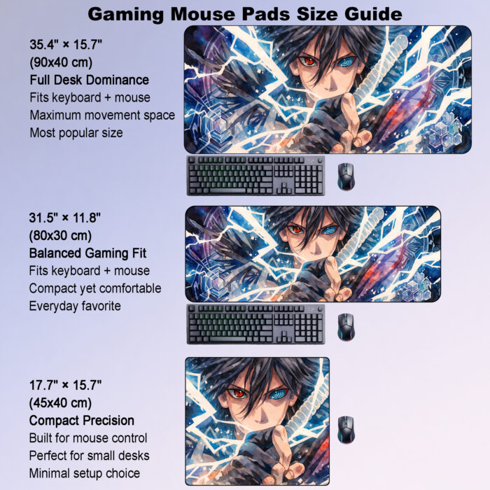 Cold, intense, and visually striking, this Sasuke-inspired design features a dramatic close-up portrait surrounded by jagged ice shards, glowing blue tones, and a piercing gaze that blends power with mystery. The contrast of frosted textures, sharp crystalline details, and bold anime styling creates a sleek, high-impact look that instantly transforms any desk setup.